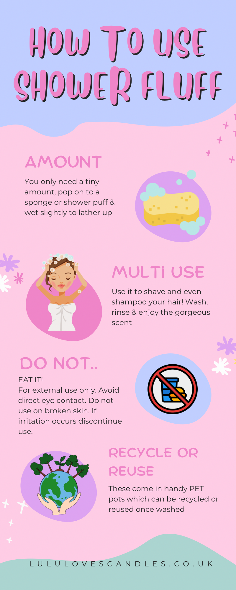 You only need a tiny amount, pop on to a sponge or shower puff & wet slightly to lather up. Wash, rinse & enjoy the gorgeous scent.